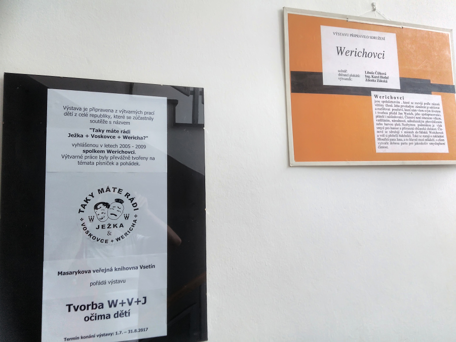 Výstava dětských výtvarných prací s názvem: „Taky máte rádi Ježka + Voskovce + Wericha?“ již zdobí prostory schodiště Masarykovy knihovny Vsetín a potrvá do 31. 8. 2017. Výstavu jsme na Vsetín převezli z Markvartovic a jejím autorem je naše bidelnice Libuše Čížková.Jedná se o zdařilé výtvarné práce děti z minulých ročníků výtvarných soutěží vyhlašovaných spolkem Werichovci.